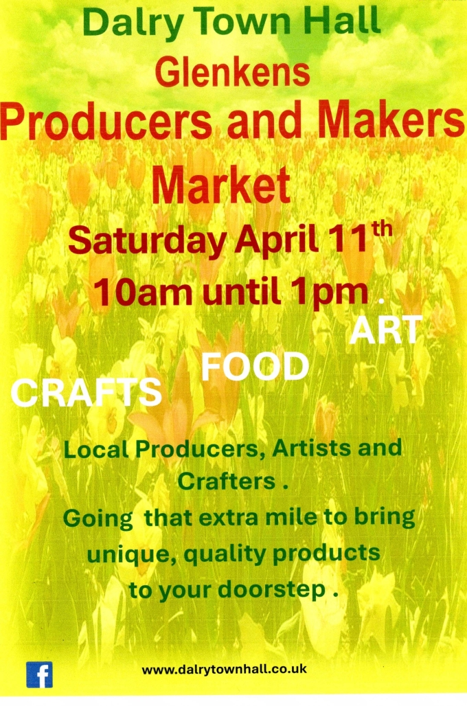 The Glenkens Producers Market, is held on the second Saturday of each month in Dalry Town Hall from 10am to 1pm. As well as a range of local food produce there is tea, coffee and home baking available in the cafe. Please come along to all future events in 2024 and support local producers, businesses and crafts people in the Glenkens.